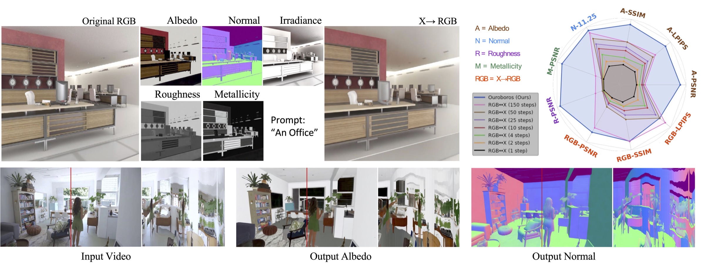 Beyond per-image quality, Ouroboros also supports a training-free video extension that improves temporal consistency, which is reflected in the framework above and the stable appearance of the predicted intrinsic maps.